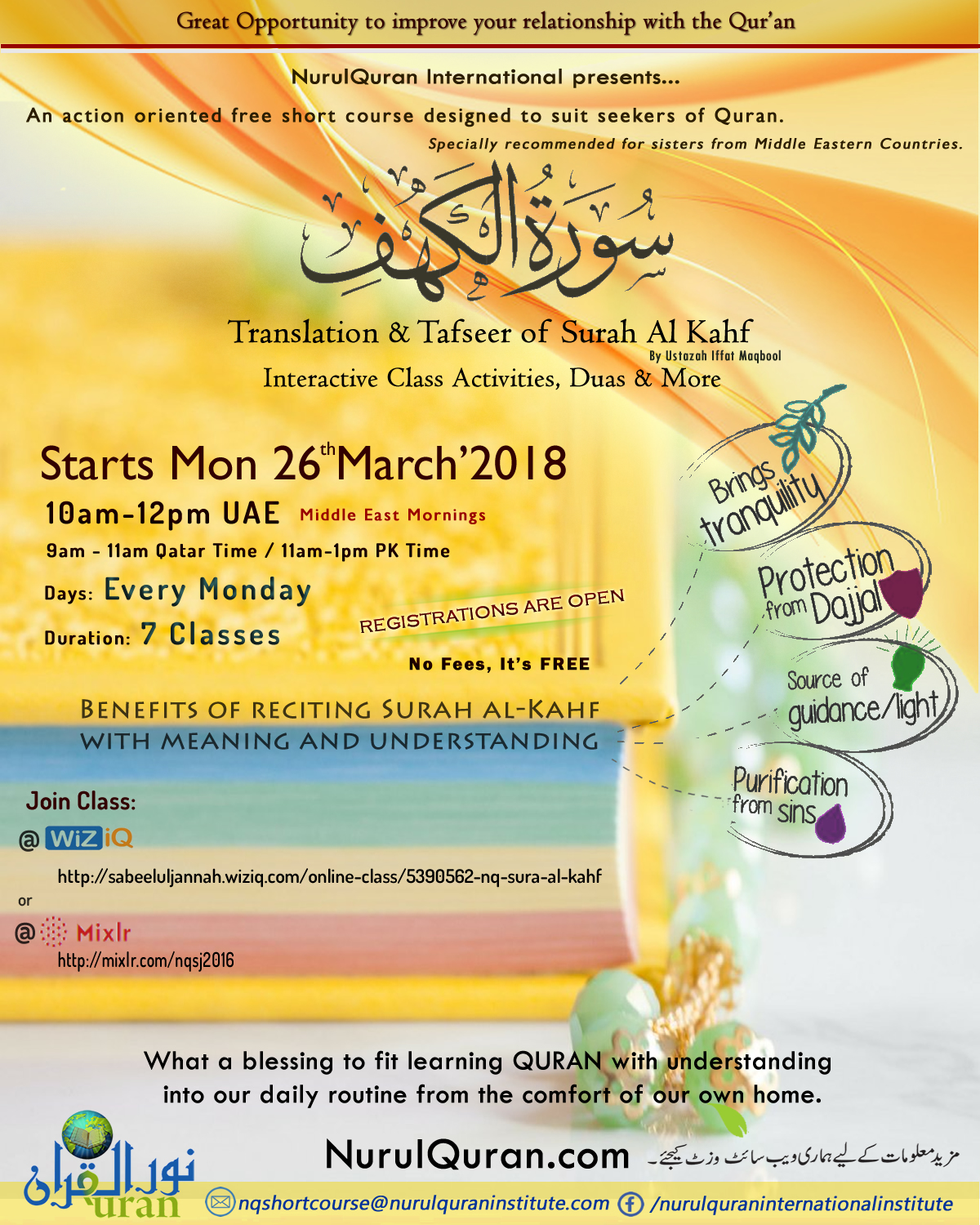 1. WIZIQ: http://sabeeluljannah.wiziq.com/online-class/5390562-nq-sura-al-kahf