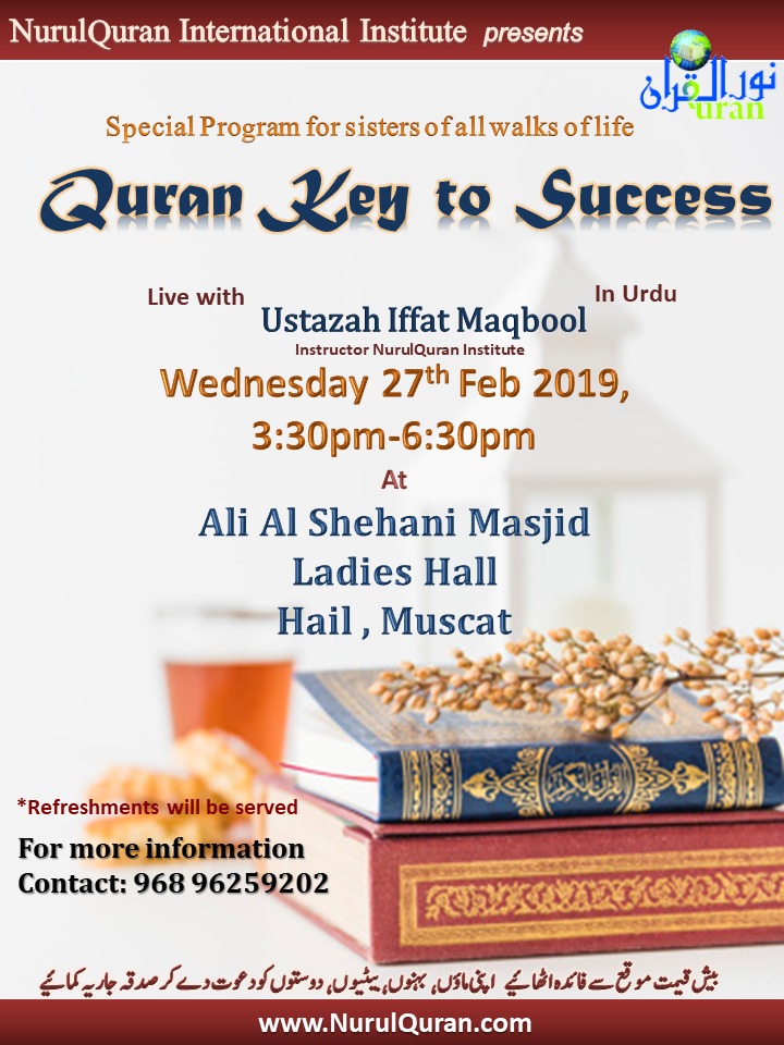 Quran, Key to Success Featured February 27, 2019 @ 2:30 PM - 5:30 PM Ali Al Shehnai Masjid Ladies Hall, Hail, Muscat