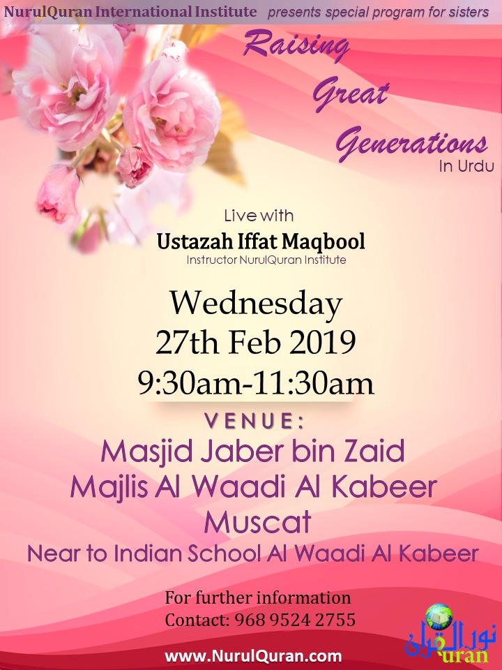 Raising Great Generations !! Featured February 27, 2019 @ 8:30 AM - 10:30 AM Masjid Jaber Bin Zaid Majlis Al Wadi Al Kabeer, Muscat