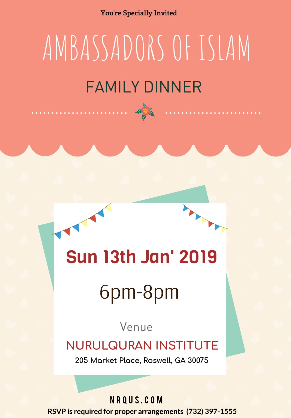 Ambassador Of Islam, Family Dinner Featured January 13, 2019 @ 5:00 PM - 7:00 PM Nurul Quran Atlanta 205, Market Place, Roswell, GA, United States