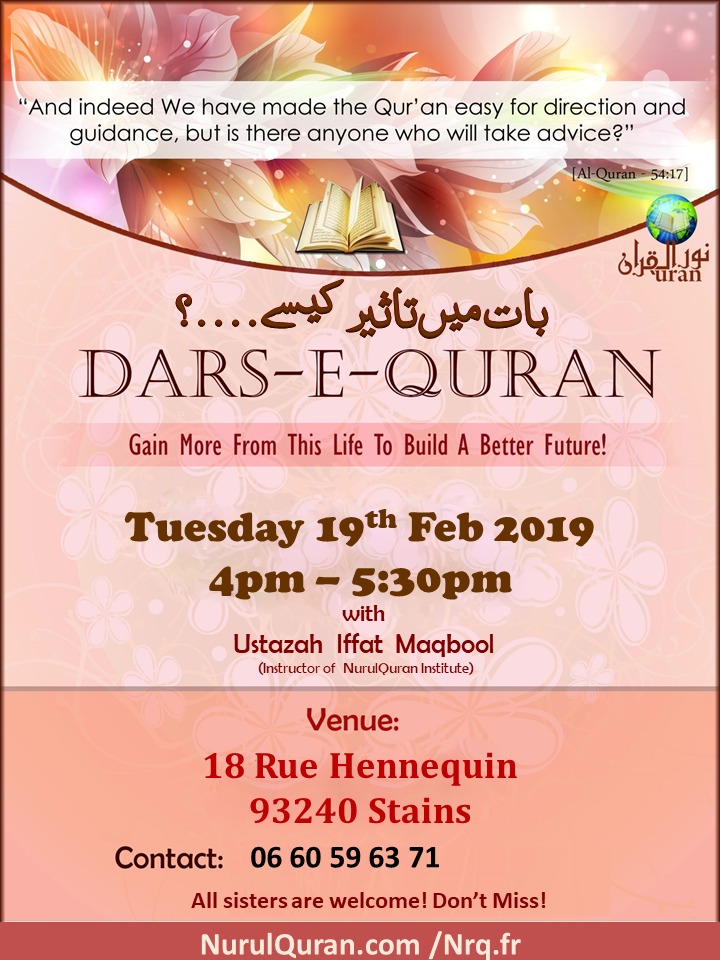 Baat me Taseer Kaise ?? Featured February 19, 2019 @ 3:00 PM - 4:30 PM Nurul Quran 18 Rue Hennequin, 93240 Stains, France