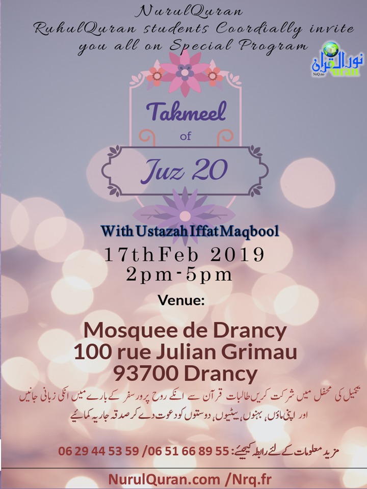 Takmeel Juz 20 Featured February 17, 2019 @ 1:00 PM - 4:00 PM Mosquee de Drancy 100 Rue Julian Grimau, Drancy, Drancy, France