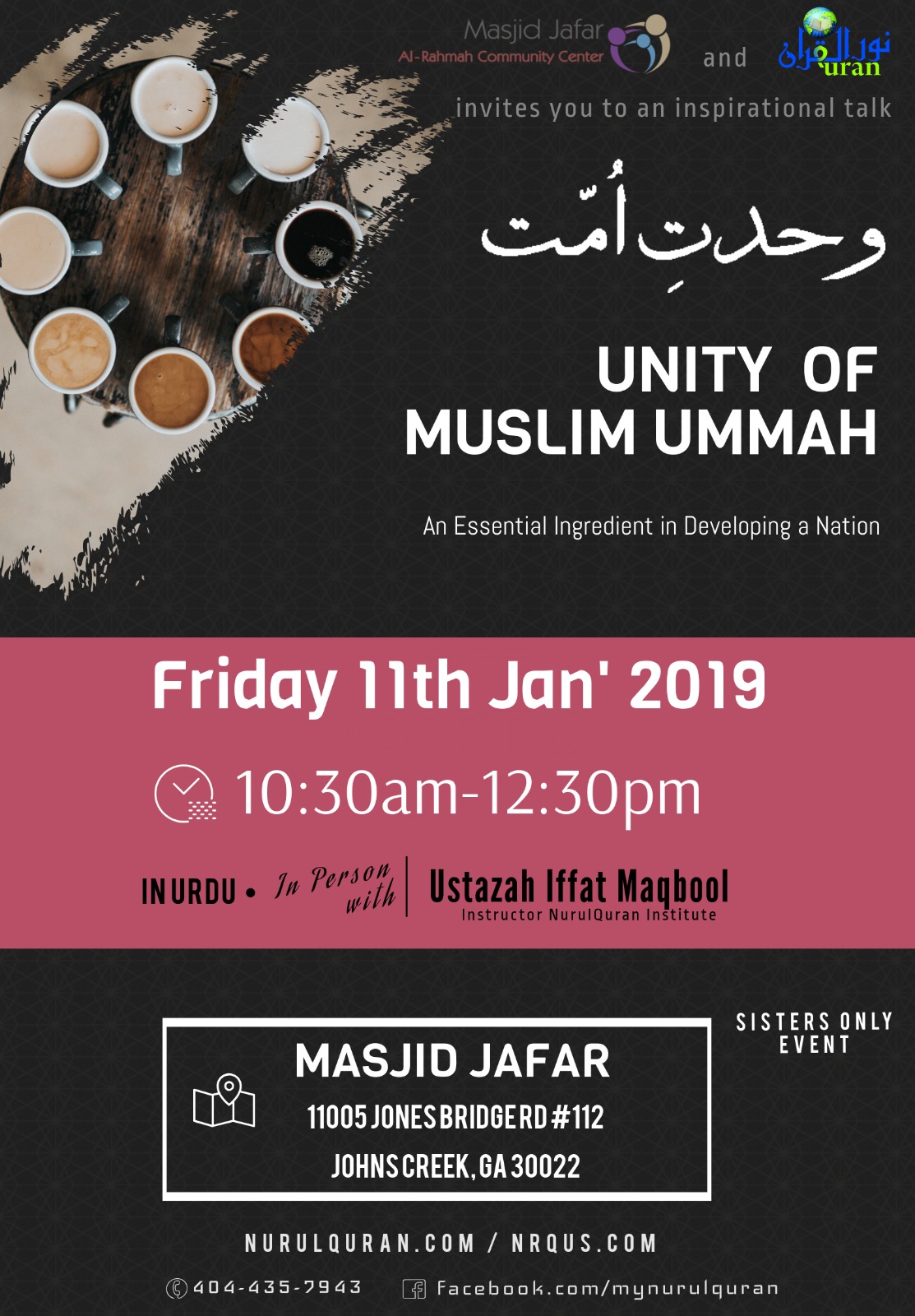 Wahdat-e-Ummat – Unity In Muslim Ummah !! Featured January 11, 2019 @ 9:30 AM - 11:30 AM Masjid Jafar 11005 Jones Bridge RD #112, Johns Creek, MI, United States