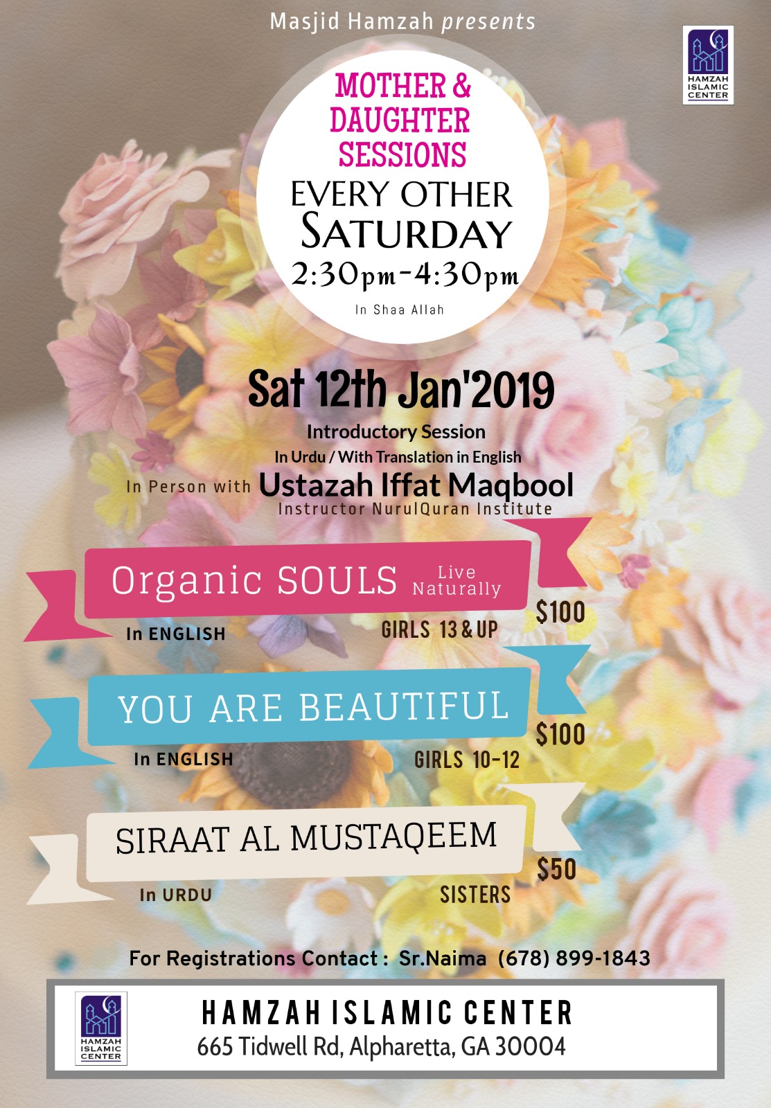 Mother & Daughter Sessions (3 Different Sessions to Benefit From, Dont Loose the Opportunity) !! Featured January 12, 2019 @ 1:30 PM - 3:30 PM Masjid Hamzah 665 Tidwell Rd,, Alpharetta, MI, United States