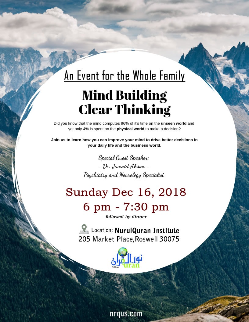 Mind Building Clear Thinking Featured December 16, 2018 @ 5:00 PM - 6:30 PM Nurul Quran Atlanta 205, Market Place, Roswell, GA, United States