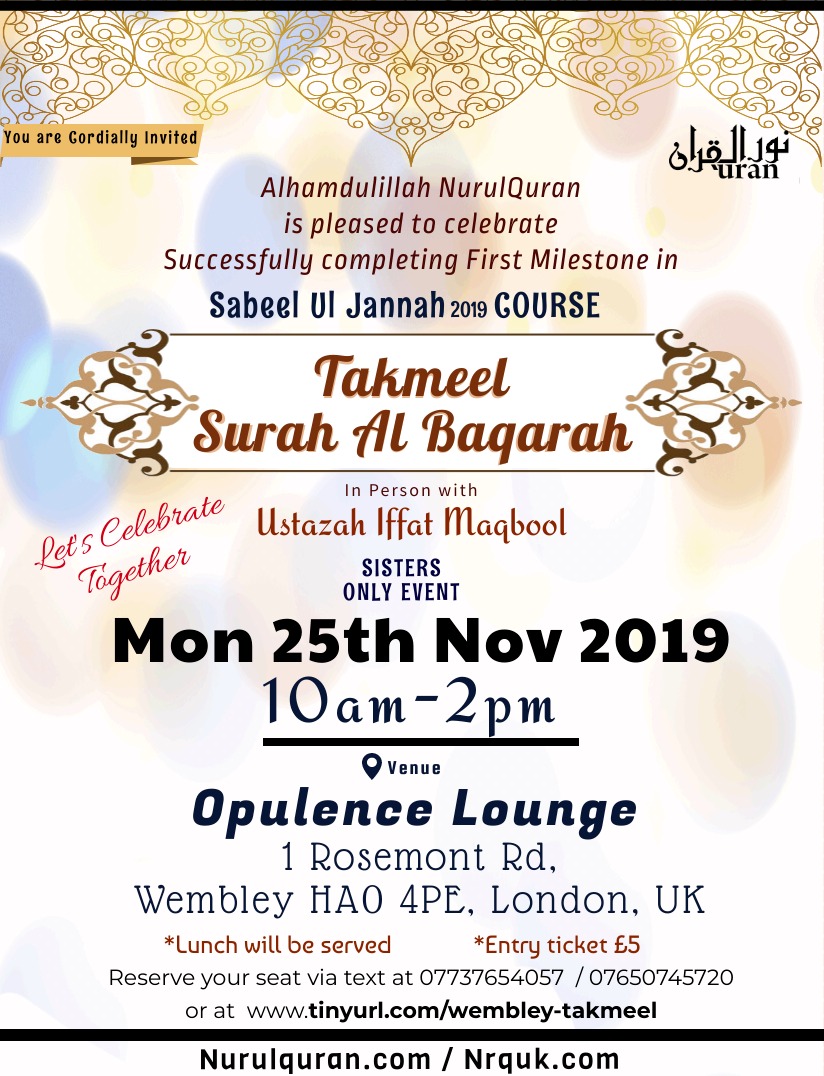 Takmeel “Surah Al Baqarah” !!! Featured November 25, 2019 @ 10:00 AM - 2:00 PM Opulence Lounge 1 Rosemont RD, Wembley, London, United Kingdom £5.00