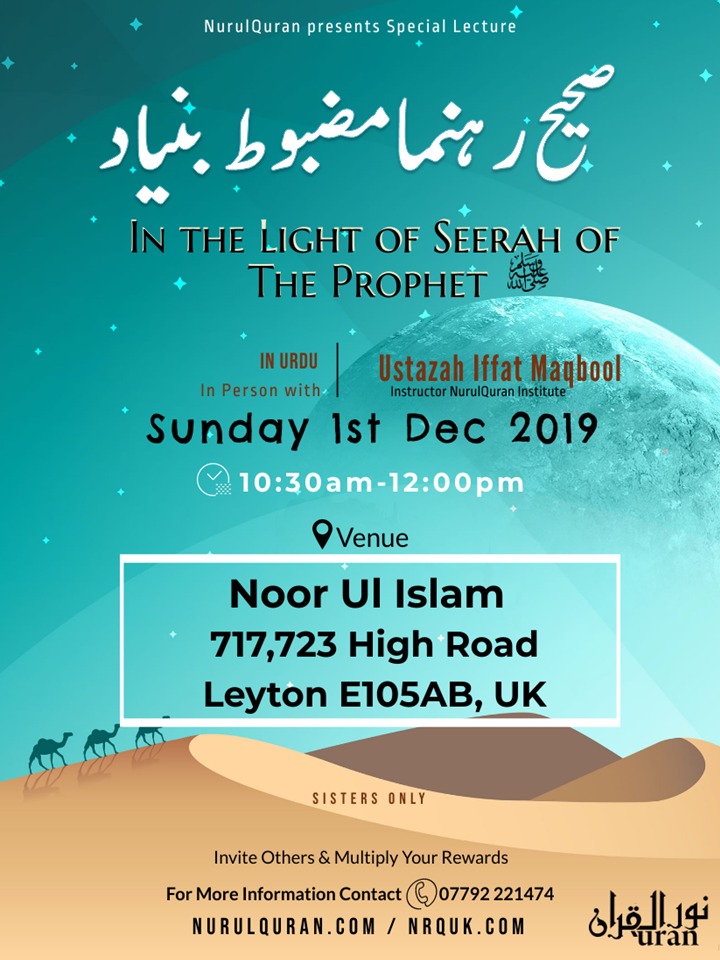 “صحیح رہنما مضبوط بنیاد” In the Light of Seerah On Muhammad (SAW) Featured December 1, 2019 @ 10:30 AM - 12:00 PM Noor ul Islam 717,723 High Road, Leyton, United Kingdom 717
