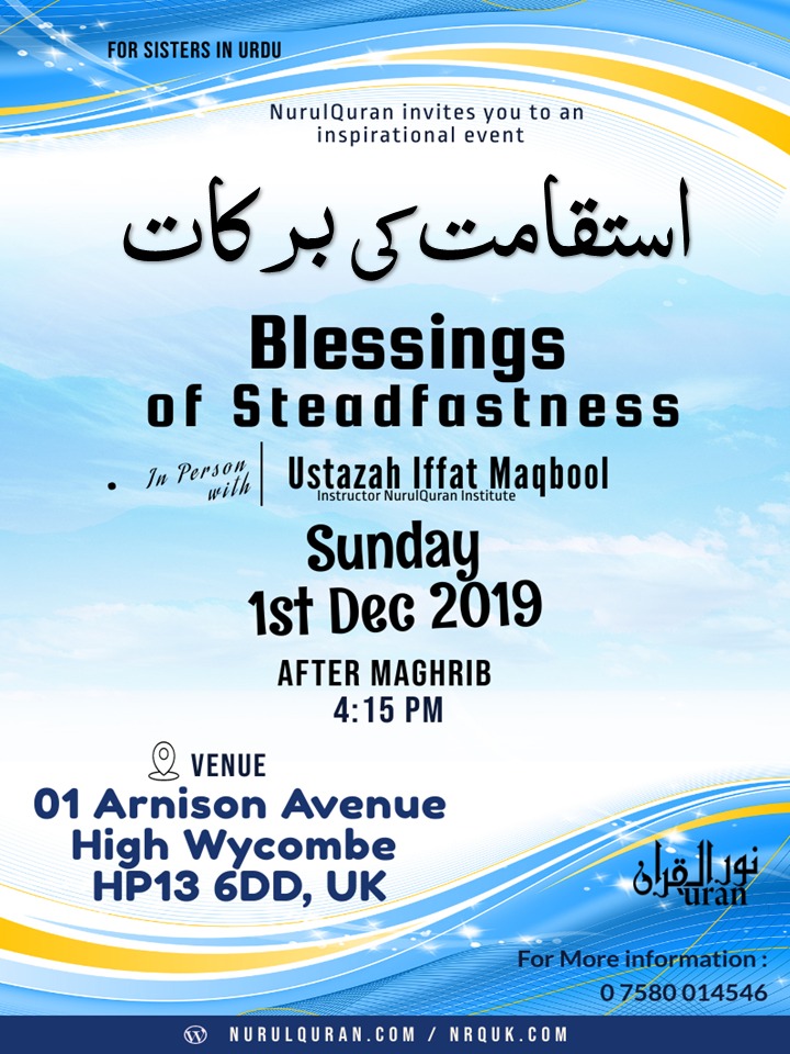 Blessings of Steadfastness !! Featured December 1, 2019 @ 4:15 PM - 6:00 PM 01 01 Arnison Avenue, High Wycombe, United Kingdom )01 01