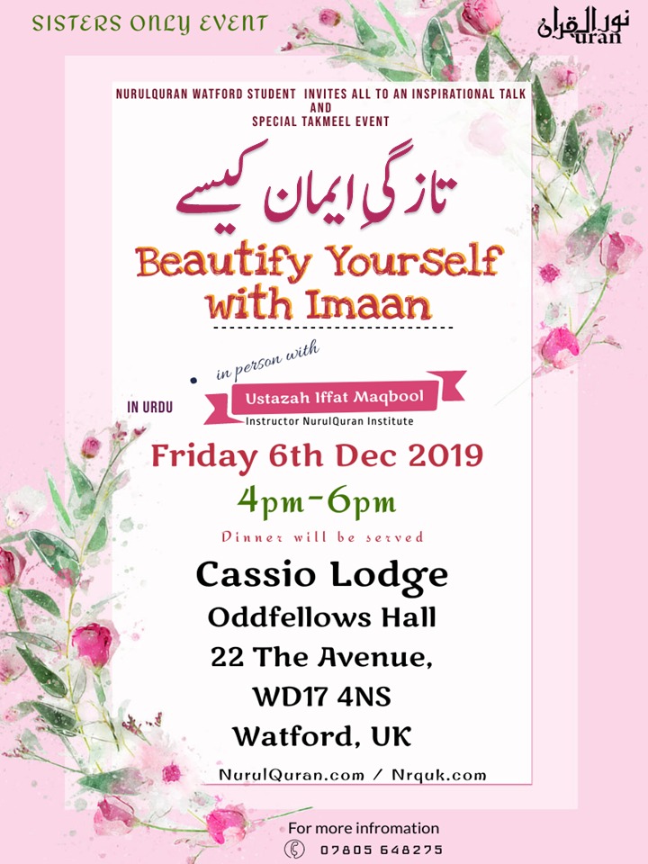 Special Live Course “Surah Al e Imran”, Aayah by Aayah Tafseer of Selected Aayah’s !!! Featured December 2, 2019 @ 10:00 AM - December 6, 2019 @ 12:00 PM Wembley Central Masjid 35-37 Ealing Road, Wembley, United Kingdom