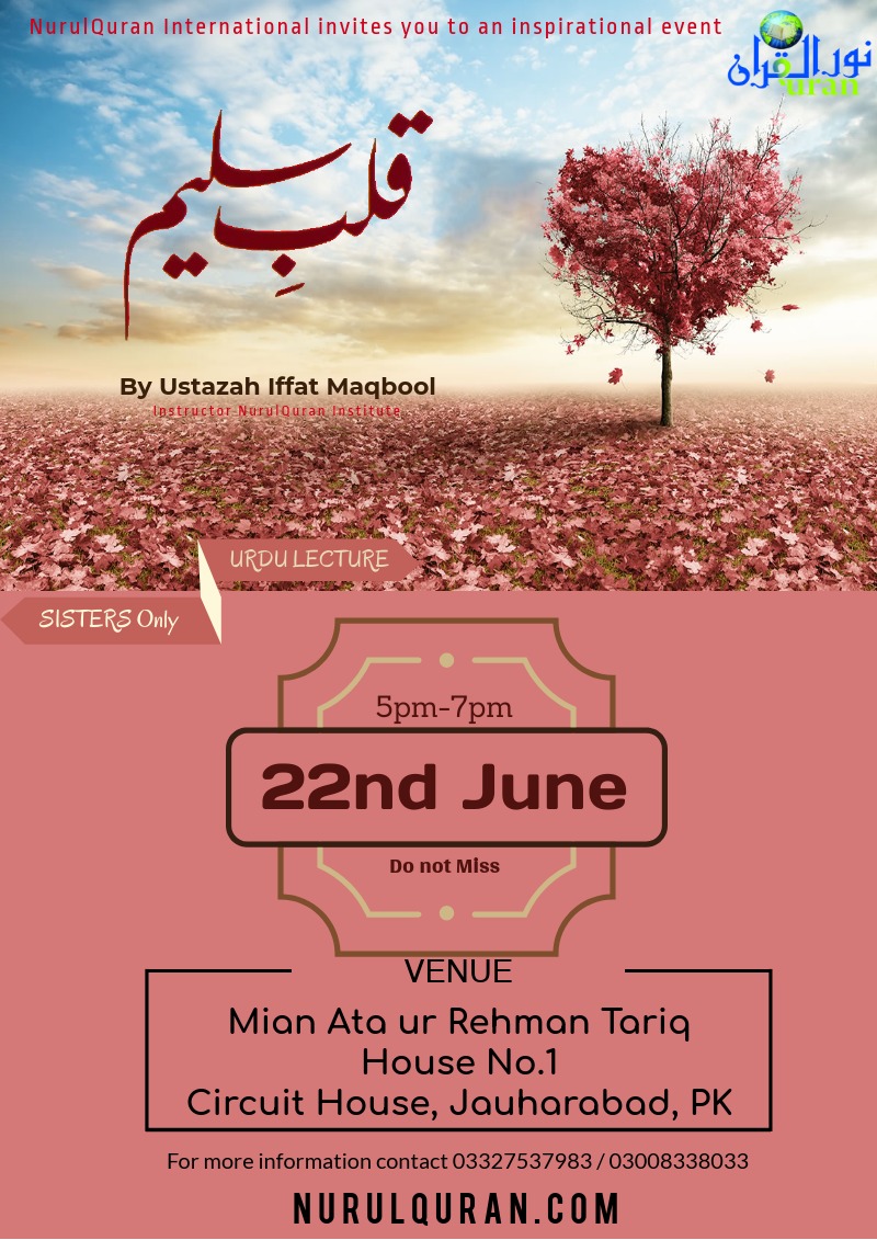 Qalb e Saleem !! Featured June 22, 2019 @ 3:00 PM - 5:00 PM Mian Ata ur Rehman Tariq House No.1, Circuit House, Johrabad, Pakistan