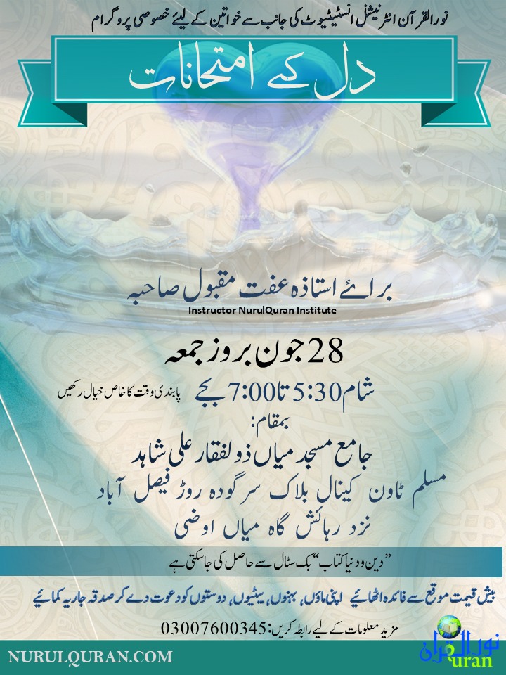دل کے امتحانات – Trials of the Heart !! Featured June 28, 2019 @ 3:30 PM - 5:00 PM Jame'a Masjid Miyaan Zulfiqar Ali Shahid Muslim Town, Sirgodah Road, Faislabaad, Pakistan