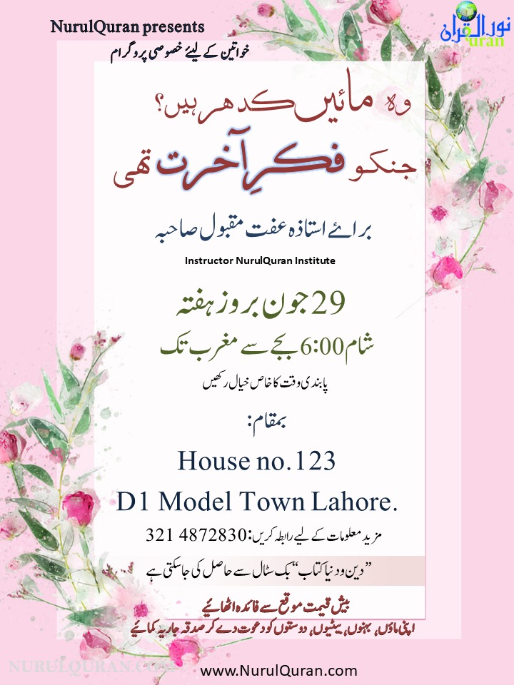 وہ مائیں کدھر ہیں، جن کو فکرِ آخرت تھی ؟, Woh Maaein Kidhar hain, jinko Fikr-e-Aakhirat thi ?? Featured June 29, 2019 @ 4:00 PM - 5:30 PM House #123 D1 Model Town, Lahore, Punjab, Pakistan House #123Model