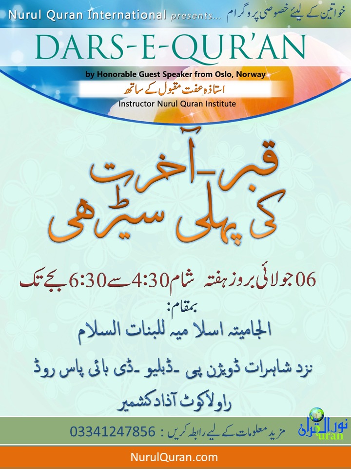 تمّسك ء بالقرآن و سنة Featured July 7, 2019 @ 3:00 PM - 5:00 PM Madrasha Jaamiat Tafheem ul Quran Lil Banaat Near Muslim Commercial Bank, Awsiyaah, Maree, Pakistan Near