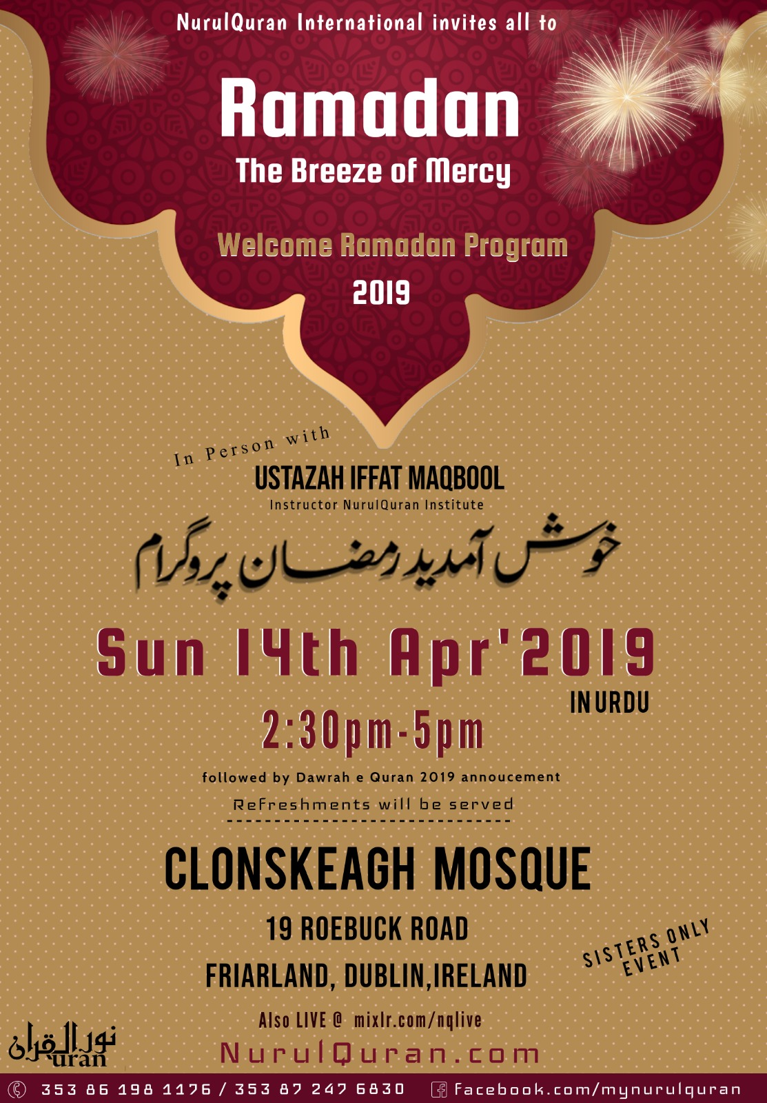 Welcome Ramadan Program ! Featured April 14, 2019 @ 12:30 PM - 3:00 PM Clonskeagh Mosque 19 Roebuck Road, Friarland, Dublin, Ireland
