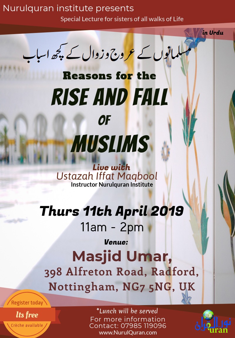 Rise & Fall of Muslims !! Featured April 11, 2019 @ 9:00 AM - 12:00 PM Masjid Umar 398 Alfreton Road, Radford, Nottingham, United Kingdom