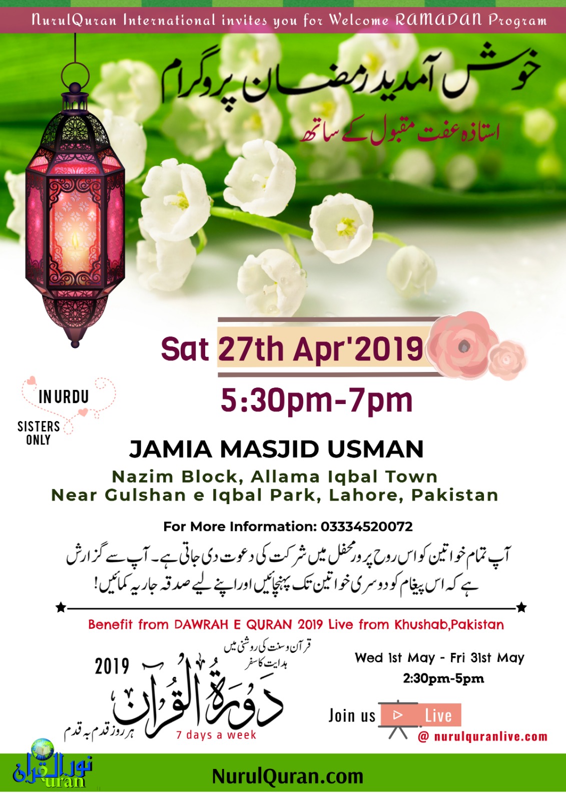 Welcome Ramadan Program !! Featured April 27, 2019 @ 3:30 AM - 5:00 PM Jamia Masjid Usman Nazim Block, Allama Iqbal Town, Near Gulshan e Iqbal Park, Lahore, Pakistan