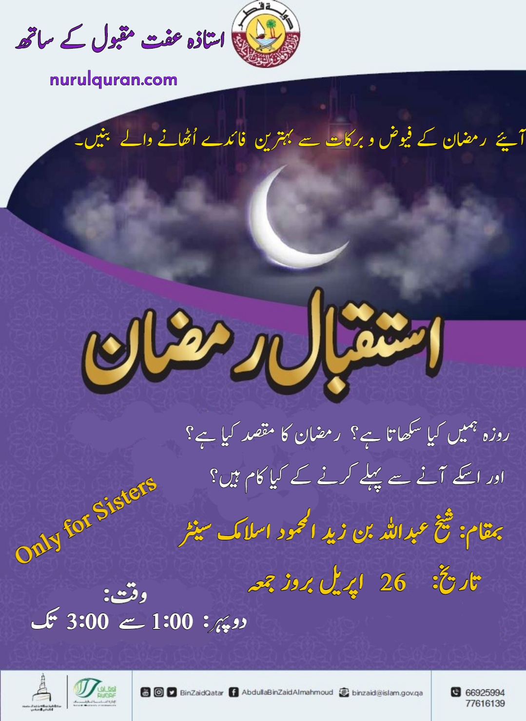 Istiqbaal-e-Ramadaan Featured April 26, 2019 @ 11:00 AM - 1:00 PM Shaikh Abdullah bin Zaid al Mahmood Islamic Center Doha
