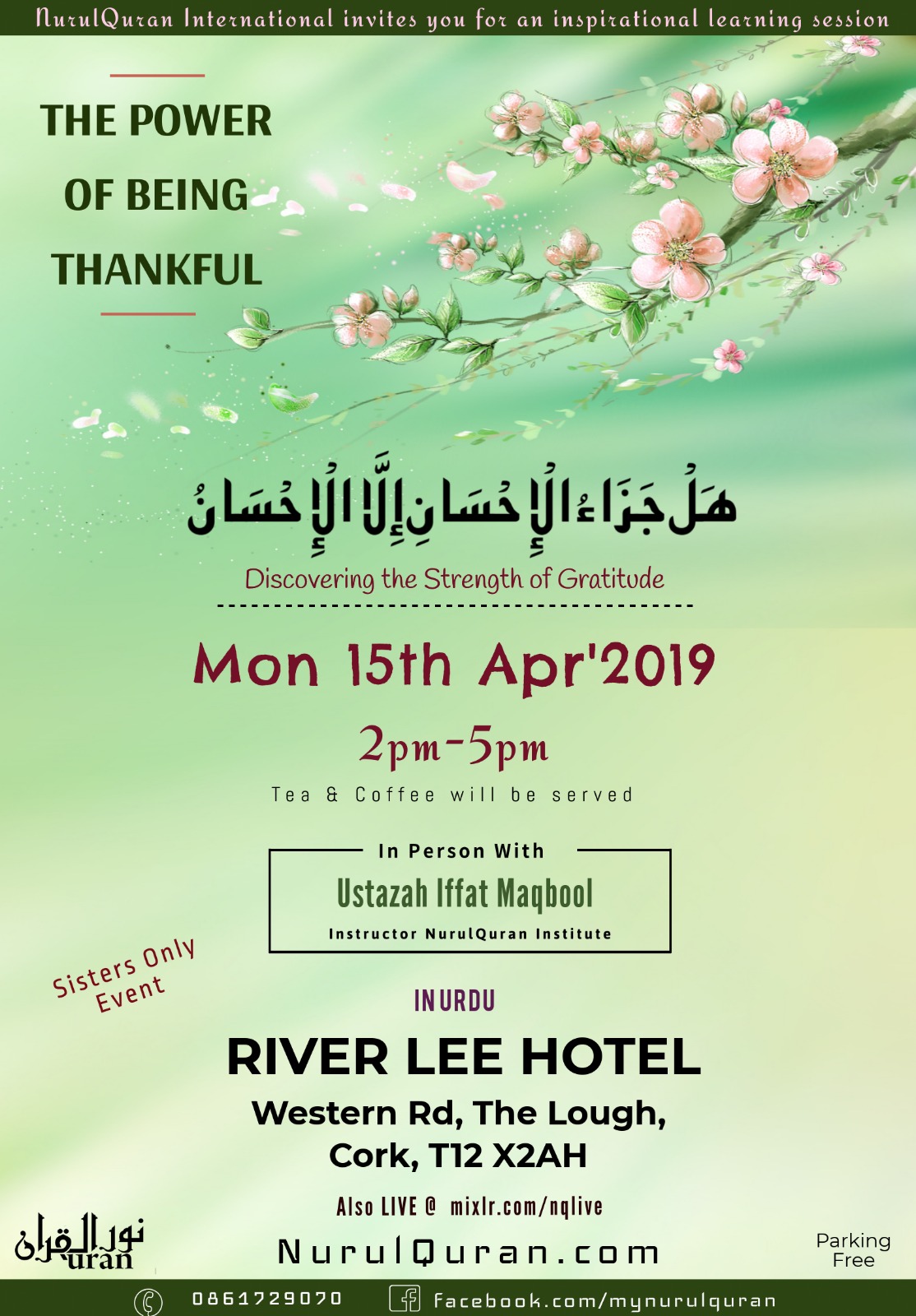 هَلۡ جَزَآءُ ٱلۡإِحۡسَـٰنِ إِلَّا ٱلۡإِحۡسَـٰنُ, The Power of Being Thankful ! Featured April 15, 2019 @ 12:00 PM - 3:00 PM River Lee Hotel Western Rd the Lough, Cork, United Kingdom