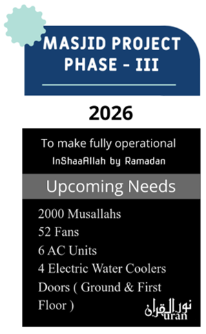 Alhamdulillah, the construction of our Masjid is progressing beautifully and quickly. With the mercy of ALLAH Subhanawatala and the support of generous hearts like yours, we are now moving closer to the hope of becoming fully operational by Ramadan 2026, In Shaa Allah.